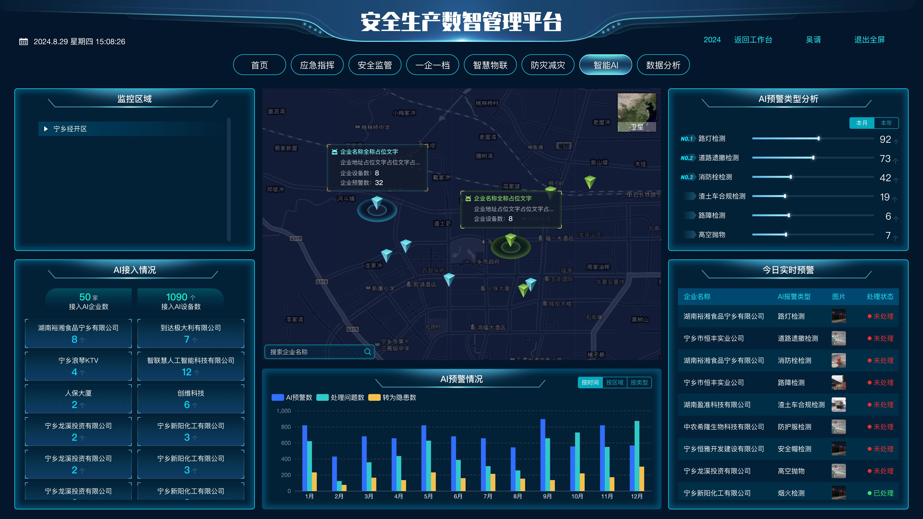 通過“智能AI”數(shù)據(jù)看板,隨時查看轄區(qū)內(nèi)各企業(yè)每日警情,AI預(yù)警情況,針對預(yù)警類型進行智能統(tǒng)計分析,直觀展示每月每年高頻違規(guī)類型和數(shù)量。