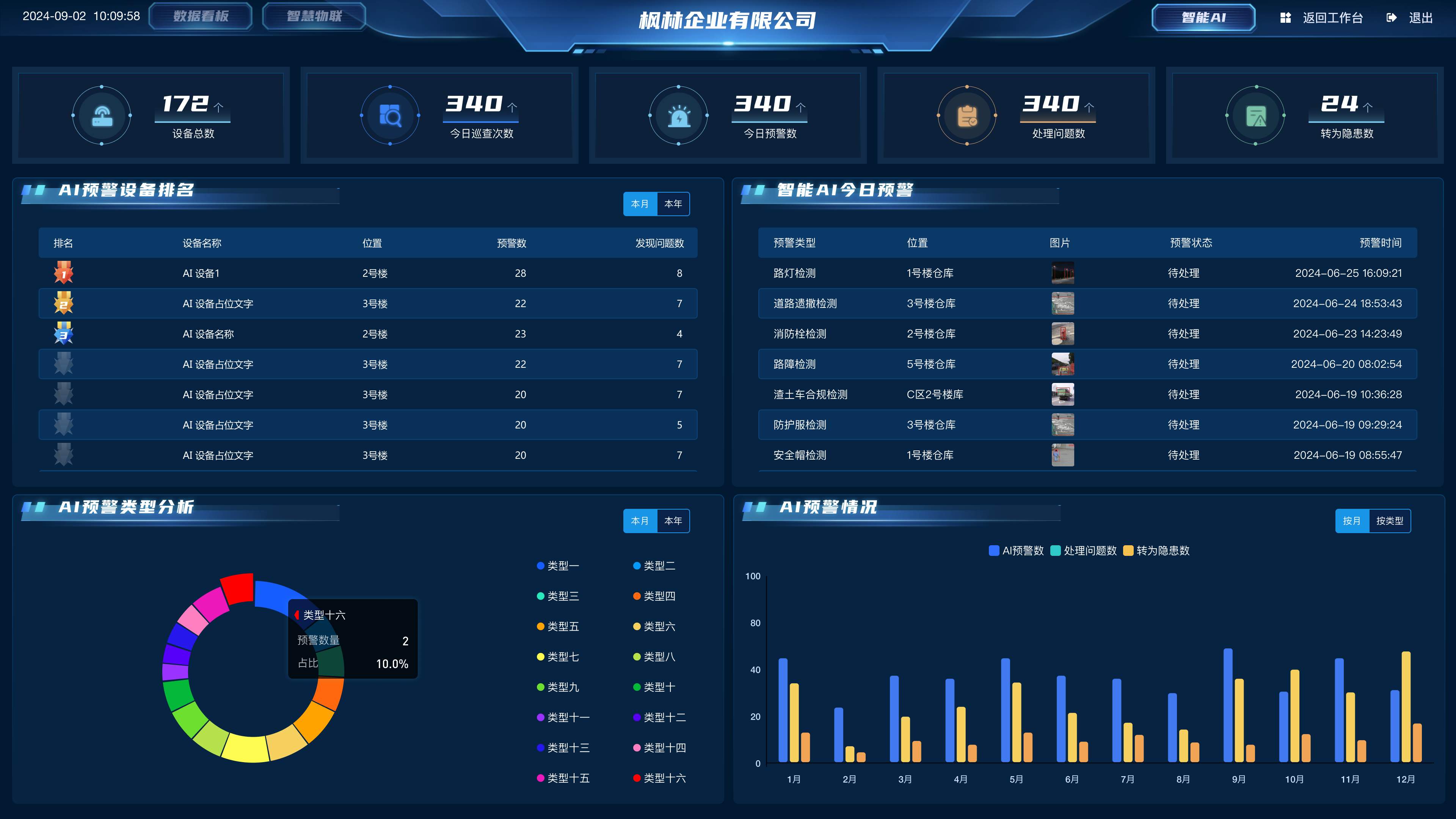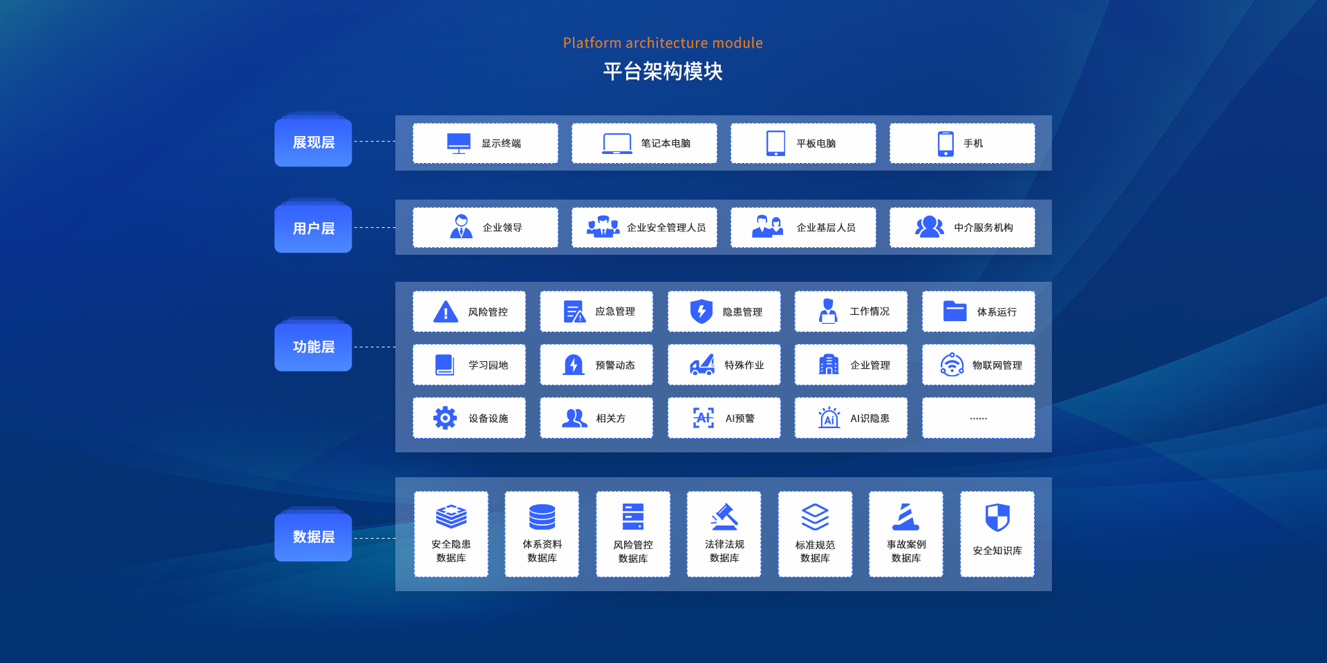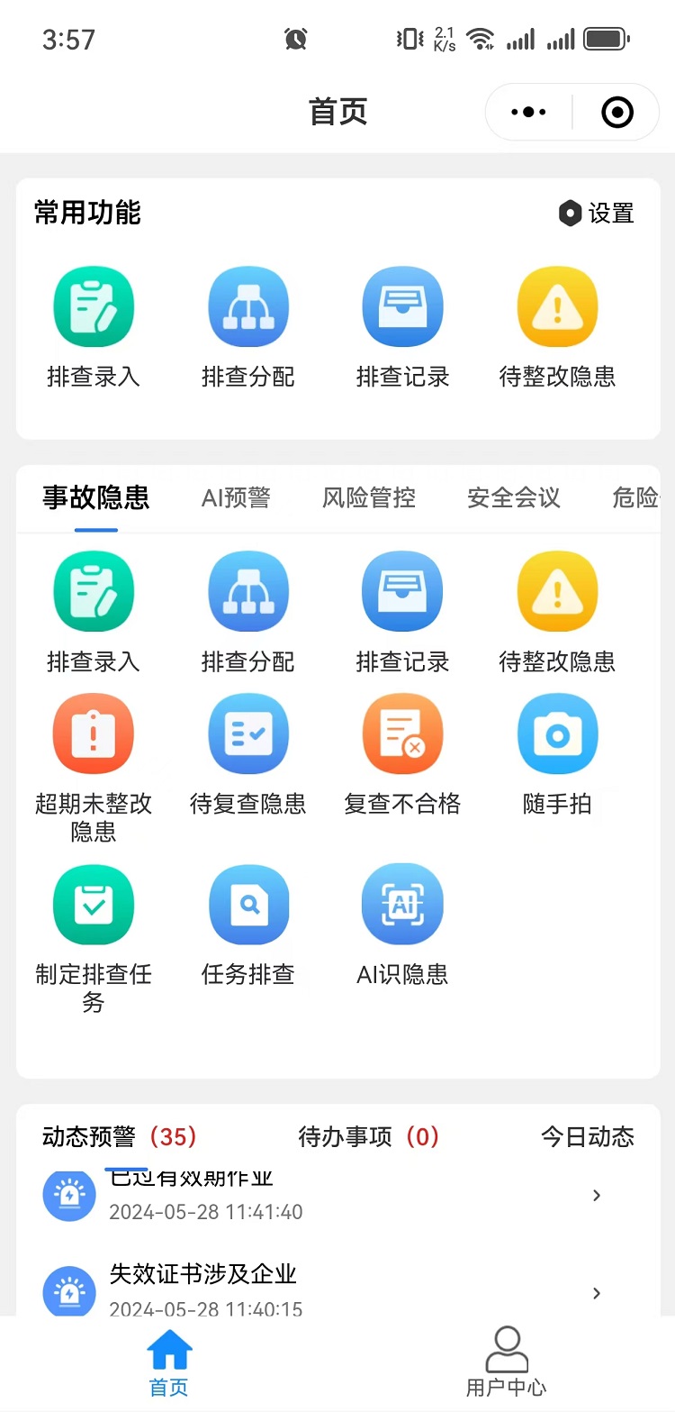 企業(yè)數(shù)智化安全管理平臺(俗稱企業(yè)端)匯集企業(yè)管理、風險管控、隱患管理、體系運行、危險作業(yè)、AI預(yù)警、AI識隱患、應(yīng)急管理、預(yù)警動態(tài)、一會三卡、物聯(lián)網(wǎng)管理、相關(guān)方、設(shè)備設(shè)施、學(xué)習園地等功能于一體,旨在構(gòu)建標準化、規(guī)范化、便捷化的管理流程,引導(dǎo)企業(yè)自主開展安全管理工作,建立健全全員安全生產(chǎn)責任制,全面提升企業(yè)安全管理數(shù)智化水平。