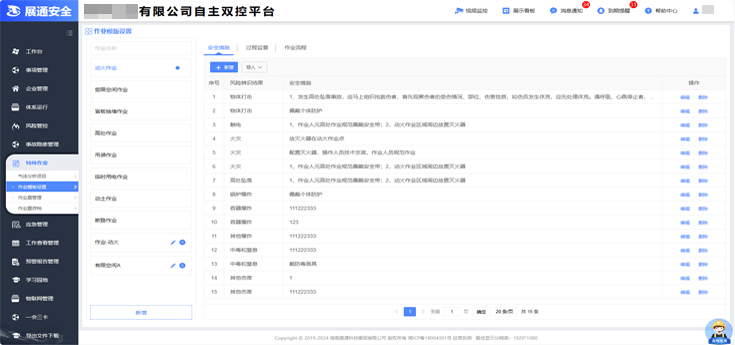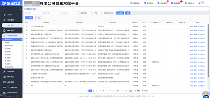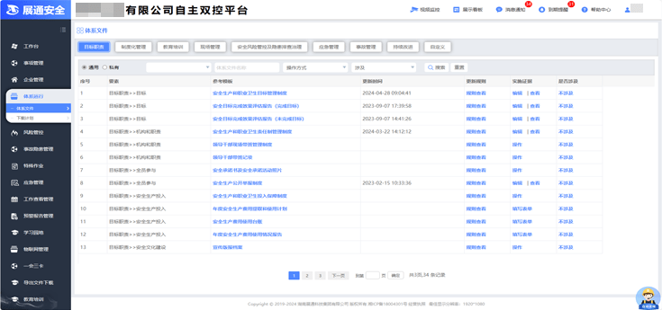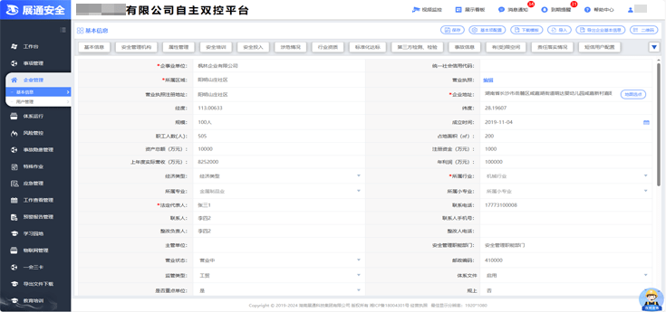系統(tǒng)提供企業(yè)基本信息、安全管理架構(gòu)、安全投入、涉危情況、行業(yè)資質(zhì)、安全培訓(xùn)、職業(yè)衛(wèi)生、涉塵涉爆、有(受)限空間、第三方檢測、檢驗等15個功能模塊,可根據(jù)企業(yè)實際情況進行選用。
