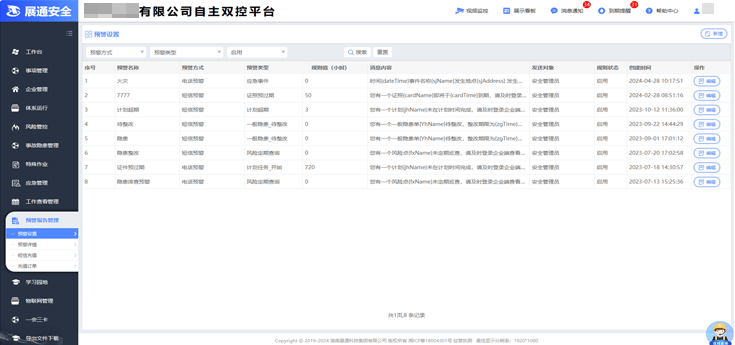 平臺提供隱患管理超期、證照(預(yù))超期、工作計劃實施、風險定期巡檢、物聯(lián)感知、應(yīng)急事件等多方面的預(yù)警,依需設(shè)置預(yù)警規(guī)則,支持短信、電話、微信等多途徑消息推送,實時提醒相關(guān)責任人進行處理;