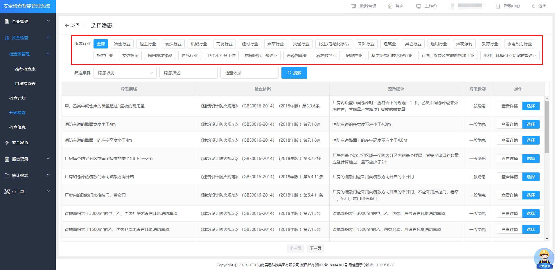 系統(tǒng)涵蓋了30個(gè)行業(yè),近400個(gè)專業(yè)的隱患數(shù)據(jù)庫(kù)。所有數(shù)據(jù)均依據(jù)國(guó)家現(xiàn)行法律法規(guī) 技術(shù)規(guī)范進(jìn)行深度挖掘,對(duì)應(yīng)隱患描述、檢查依據(jù)、整改建議、隱患級(jí)別等一目了然,安全檢查工作提供精準(zhǔn)規(guī)范的數(shù)據(jù)支撐。