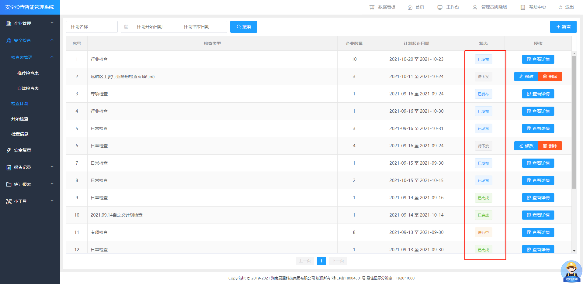 全面整合安全檢查工作業(yè)務(wù)數(shù)據(jù),比如檢查和復(fù)查情況、隱患整改率等統(tǒng)計(jì)、企業(yè)安全檢查工作開(kāi)展排名、人員安全檢查工作執(zhí)行排名、檢查計(jì)劃實(shí)施進(jìn)度等一目了然,為有的放矢地開(kāi)展安全檢查工作提供數(shù)據(jù)支撐。